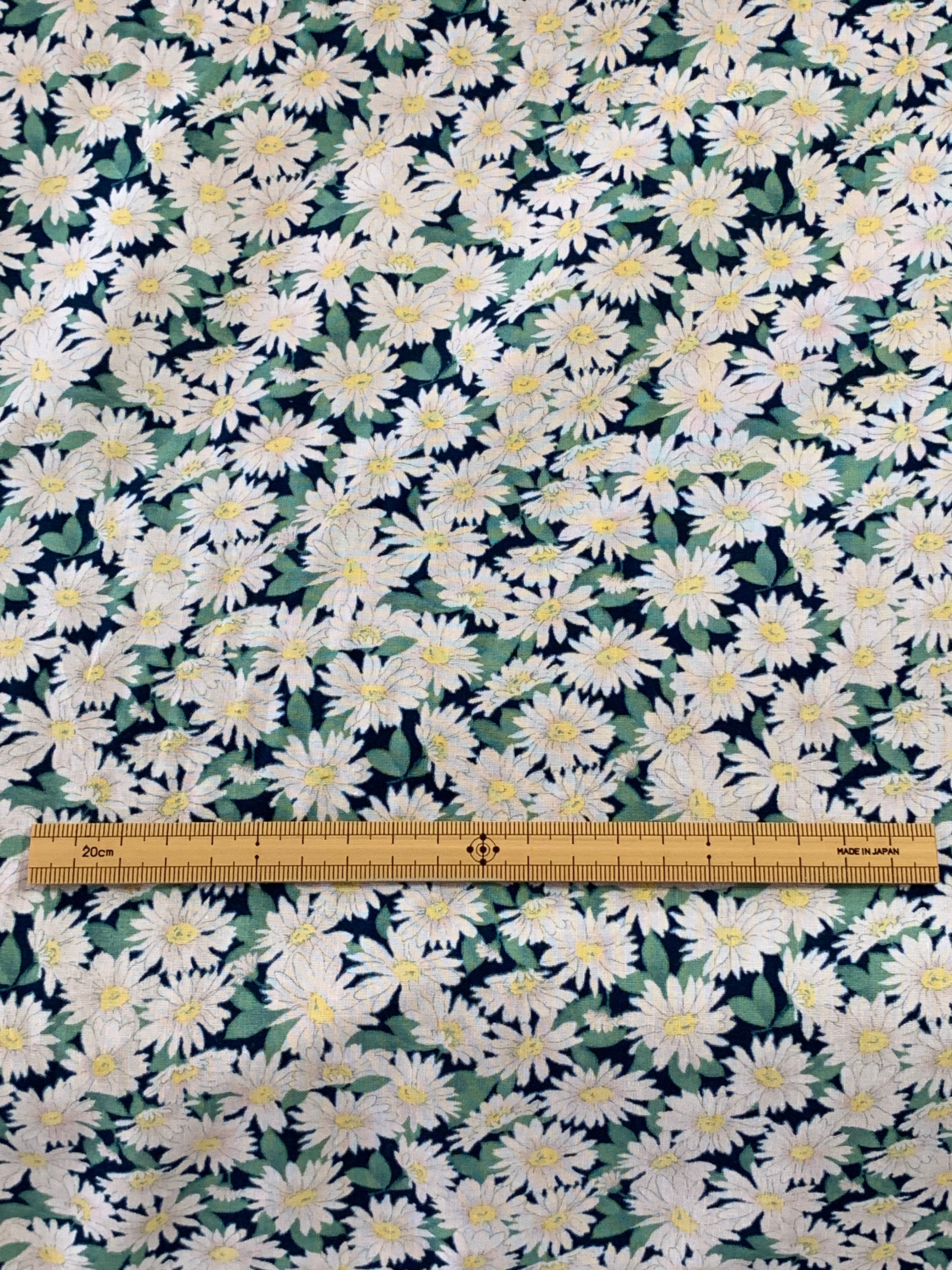 美しいマーガレット柄が描かれたダークグリーンのシャーティング生地です。肌触りが柔らかく、通気性にも優れたコットン100%です。