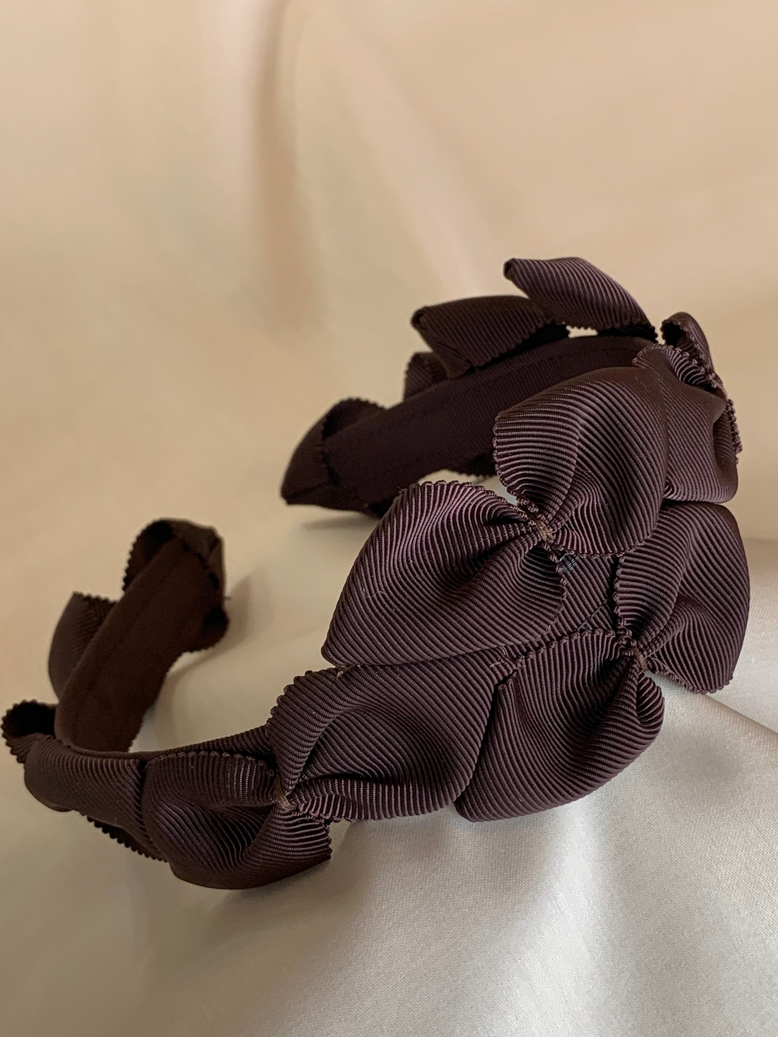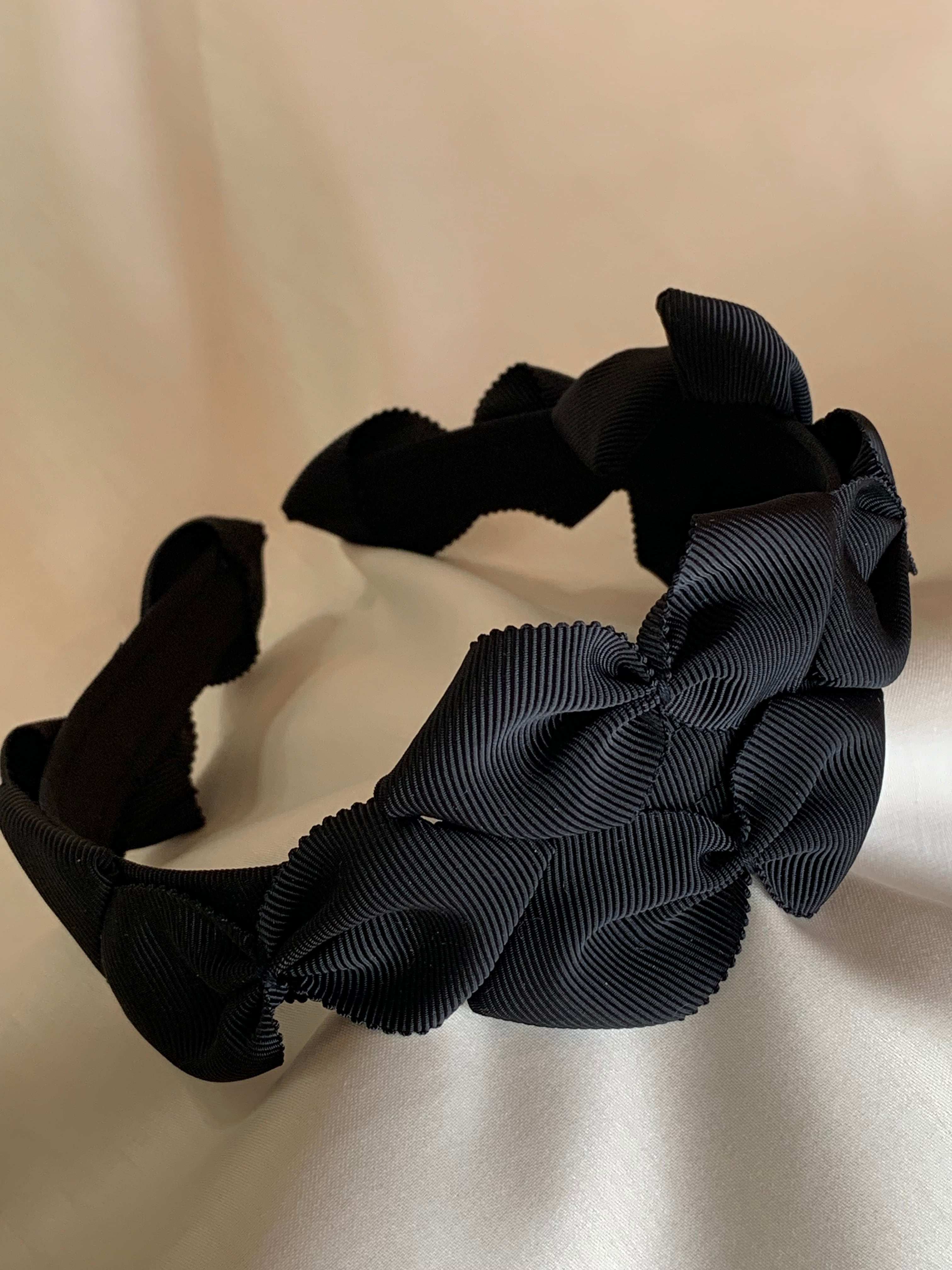 グログランリボンを使用したカチューシャです。一見シンプルに見えますが、カチューシャ全体がリボンで飾られていて、とても可愛いく、どんなスタイルにもマッチします。