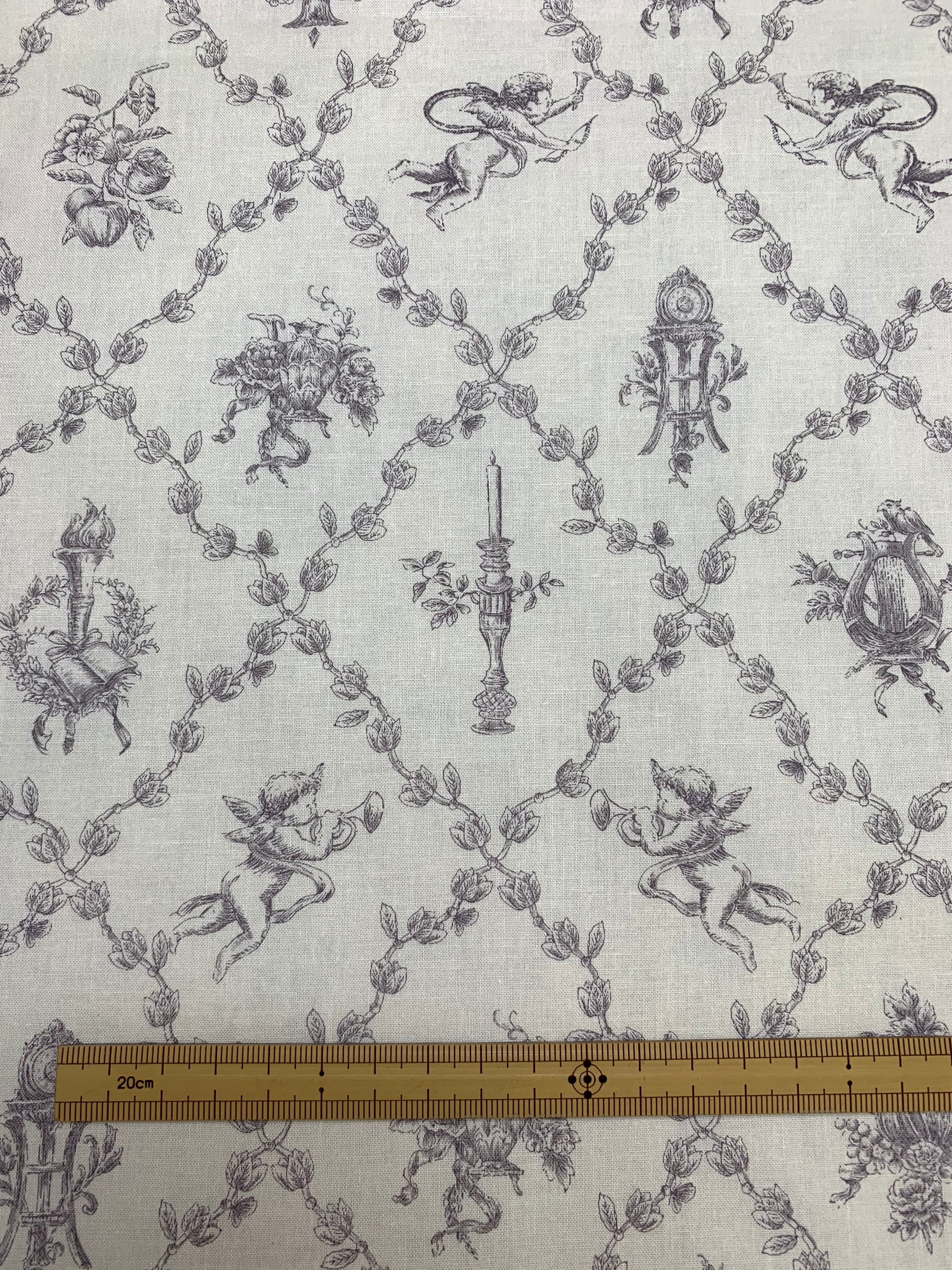旧約聖書から拾い集めたモチーフを、小さな箱庭のような一区画ごとに、宝物のように閉じ込めたデザインが魅力的な生地です。