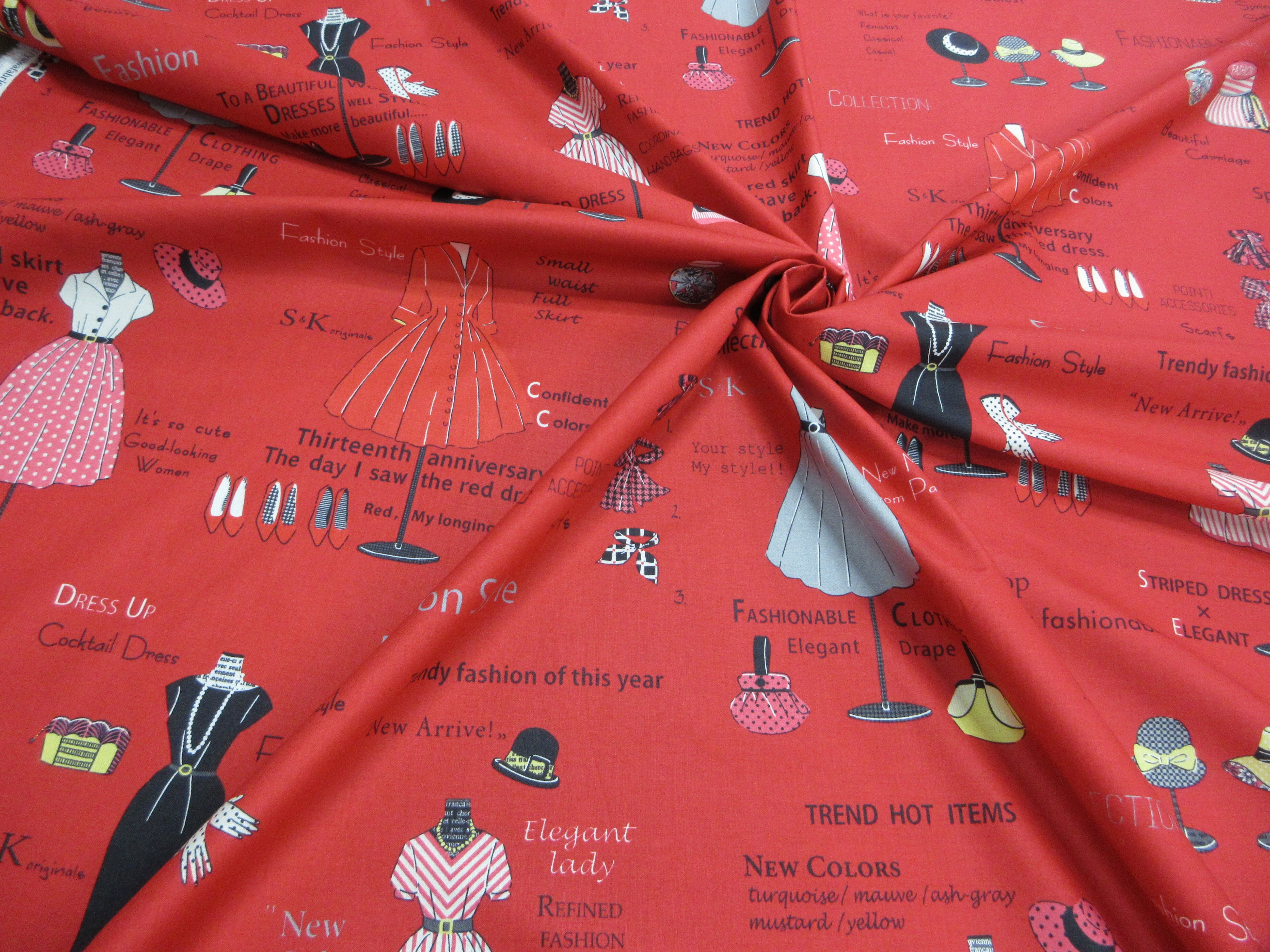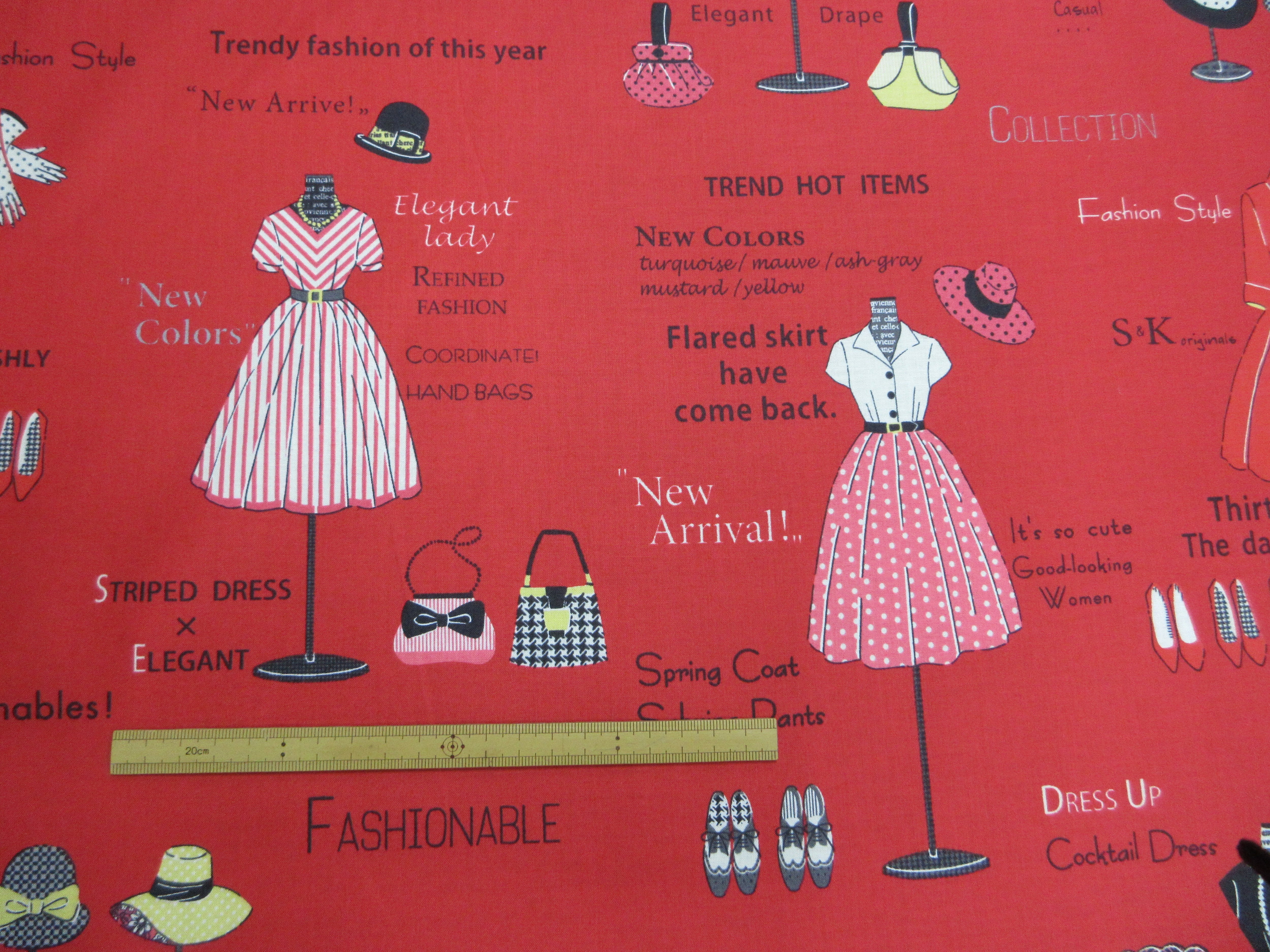 トルソー柄に掛けられた帽子やワンピースがかわいいシャーティングプリント生地です。